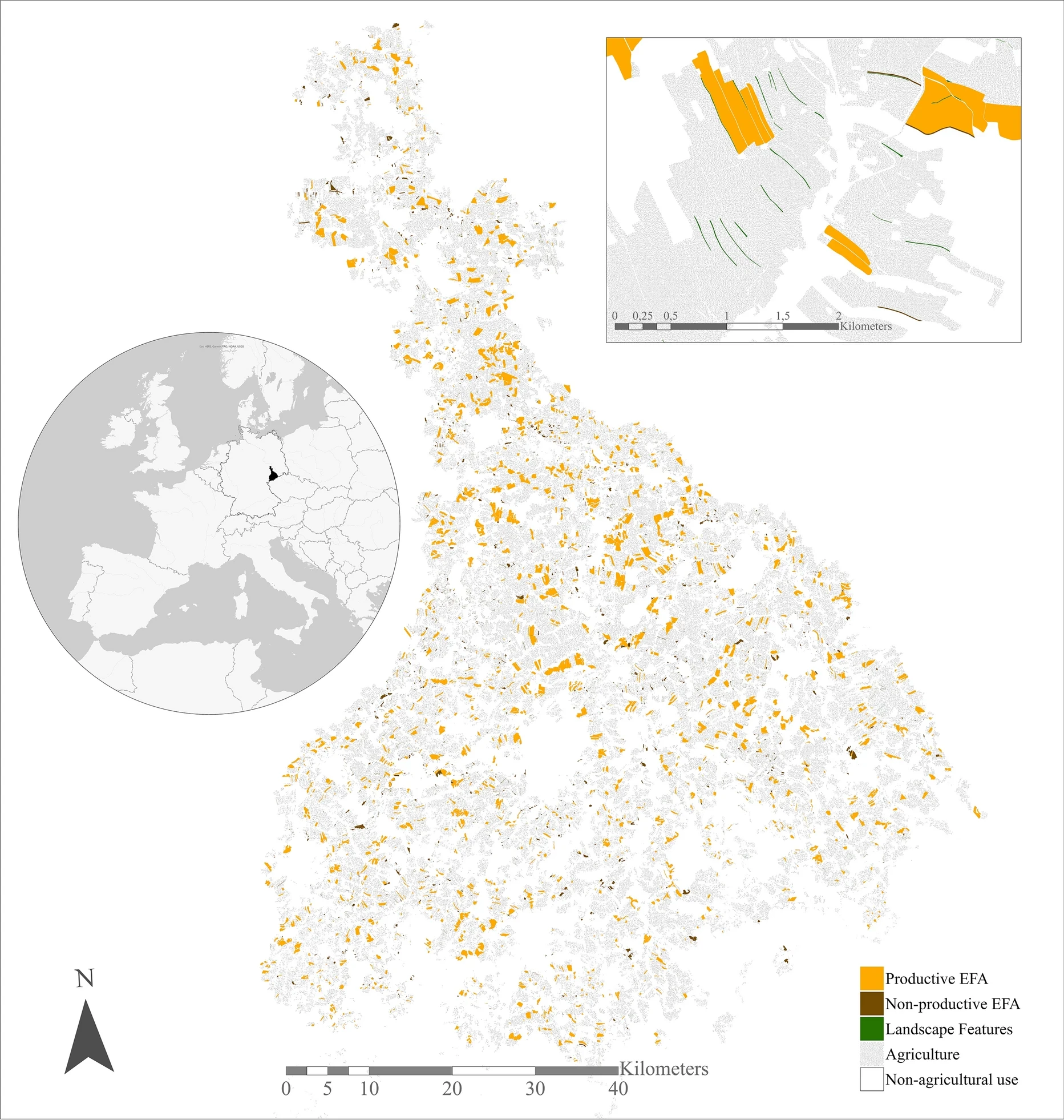 We used a multinomial model approach using field-level land use and management data from 879 farms that complied with the EFA policy in 2019 in the Mulde River Basin in Saxony, Germany. Geospatial environmental information was used to assess which predictor variables (related to farm context, field context or field terrain and soil conditions) increased the probability of a field being assigned to a particular EFA. We tested the hypothesis that productive EFAs are more often implemented on fields that are more suitable for agricultural production and that EFA options that are considered more valuable for biodiversity (e.g. non-productive EFAs) are allocated on fields that are less suitable for agricultural production.